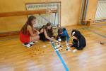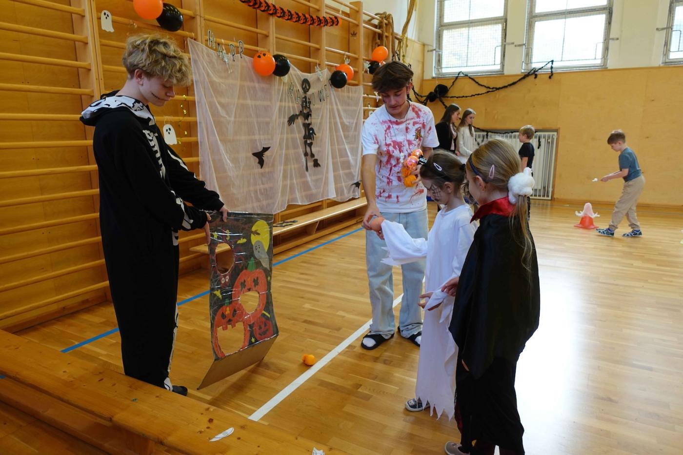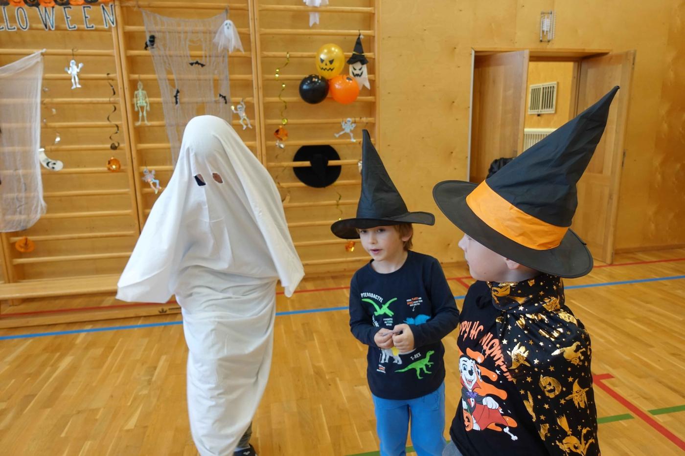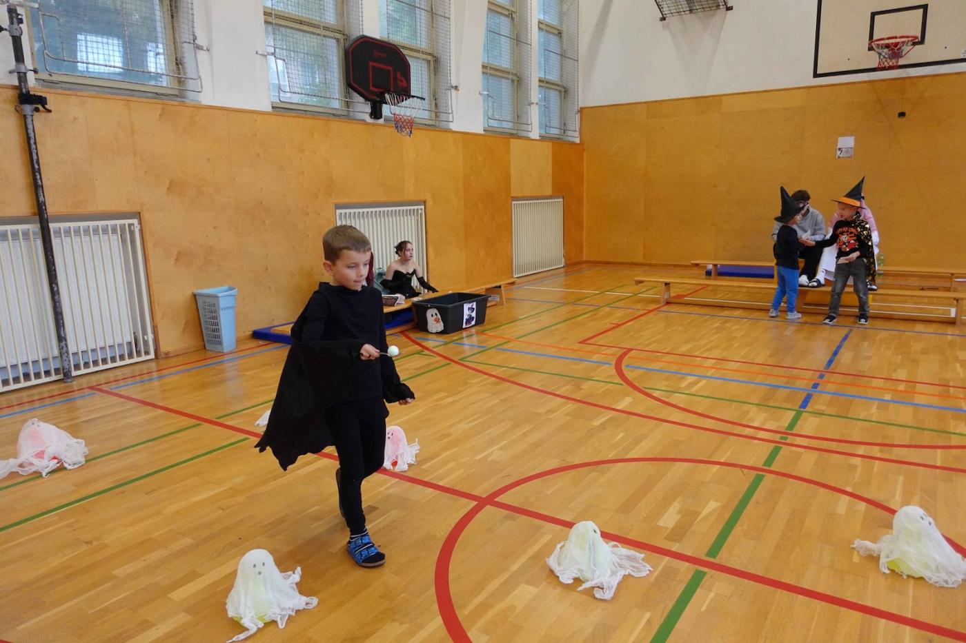 Děti musely zachránit svou paní učitelku, protože ji odnesli duchové a příšery. Aby ji vysvobodily, musely splnit strašidelné úkoly. Prvňáčci chodili po dvojicích a plnili úkoly, např. procházeli „lesem“, ve kterém žili hodní duchové, kteří nesnášejí lidský dotyk, takže je museli obejít slalomem, nebo namotávali pavoučka zpět do sítě.