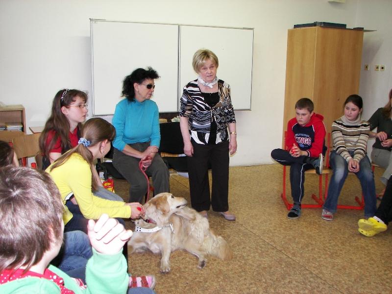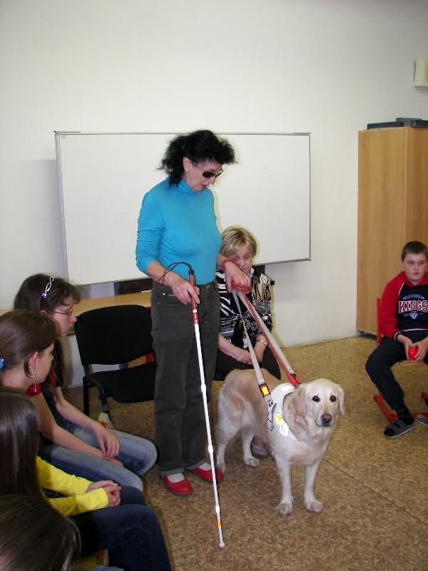 Rovněž poučná, i když chvílemi smutná, byla návštěva slepé paní Kondrové s vodícím psem a paní Kvochové se zbytkovým zrakem - z občanského sdružení "Sdružení porozumění." Vyprávěly nám, jak se žije lidem s částečnou či úplnou slepotou, jaké kompenzační pomůcky nevidomí lidé mohou používat, děti si "ohmataly" např. bílou slepeckou hůl, speciální sluneční a lupobrýle, monokulár, "pípátko" signalizující, že je např. hrneček již plný vody, čtečku různých nápisů. Osobní setkání se slepými na některé působilo smutně, nicméně jsme se dozvěděli, že slepotou život nekončí a že i nevidomí lidé mají šanci a právo na porozumění a štěstí.