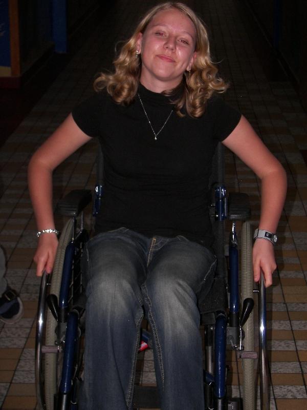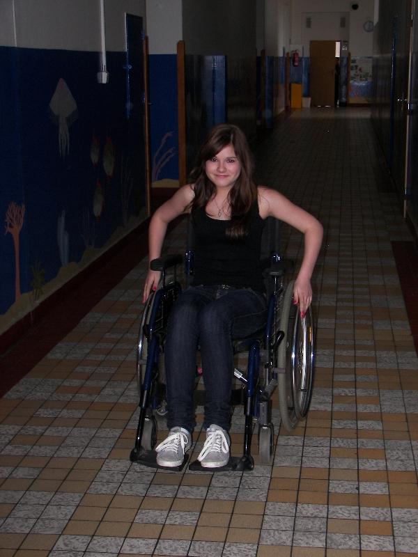 Následovala část, která děti také velmi zaujala, zvláště praktické vyzkoušení. Paní uč. Králová přivezla do školy invalidní vozík, vyprávěla dětem o svém strýčkovi, který v mládí následkem dopravní nehody ochrnul, předvedla manipulaci s vozíkem. Všichni si jízdu na vozíčku vyzkoušeli, pro některé bylo dost obtížné se s vozíkem např. otočit na úzké školní chodbě či zastavit, nakonec jsme však zvládli i pohyb ze a do schodů. Naprosto jsme se shodli na tom, že je dobré si pocit "bytí" na vozíčku vyzkoušet, nicméně nikdo z nás by na něj nechtěl být trvale upoután.