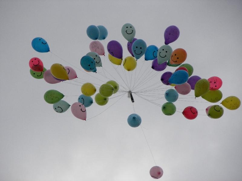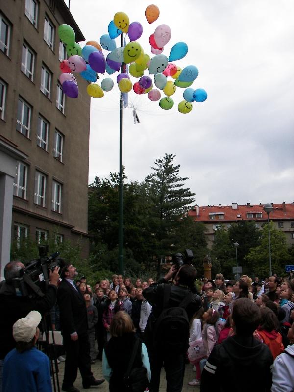 Pak se k obloze vznesla kytice padesáti balónků s logem školy, které v závěsném tubusu nesly informace o naší škole a nabídku ke spolupráci: