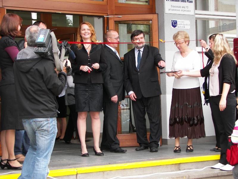 Slavnostní stuhu společně přestřihli naši hosté náměstek primátora Ing. Petr Náhlík, radní pro oblast školství Mgr. Petra Kacovská, tajemnice Magistrátu MP Ing. Dagmar Škubalová a vedoucí odboru školství Ing. Eva Prokopová. A pak už mohli vstoupit do budovy žáci.