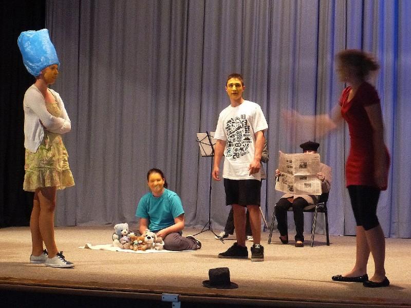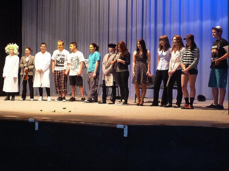 Ve čtvrtek 3. 5. pak vystoupily 3 kolektivy s dramatizacemi. Žáci 6.B sehráli v Aj klasickou pohádku "O Karkulce," kolektiv žáků 8.A třídy vystoupil s moderní fr. pohádkou "Une paire de chaussures" (Pár bot) a konečně žáci 9.B třídy nastudovali komponovaný pořad "Muzeum voskových figurín"v Aj, Fj, Nj, Čj a It. Z jejich výkonů, hlavně však výsledků máme velkou radost. Všem žákům patří obrovský dík a obdiv za přípravu, hlavně však za předvedené výkony. Umístili se takto: