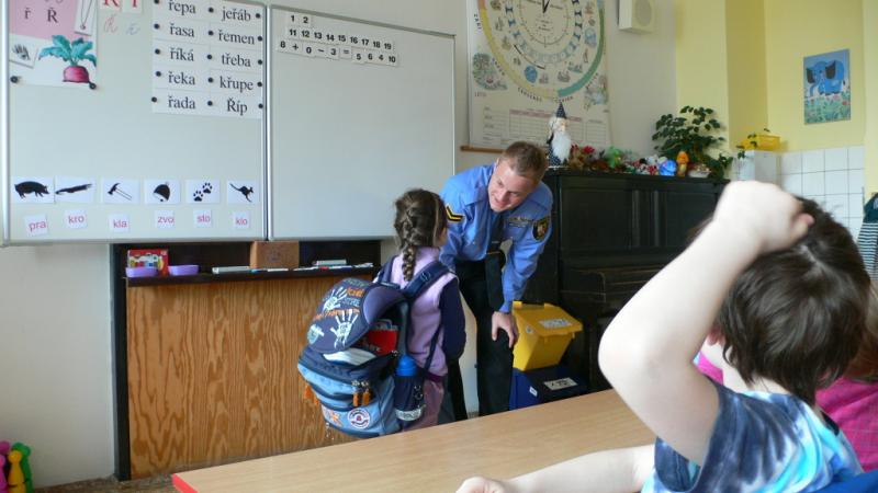 Setkání s cizí osobou může být milé, příjemné, ale také ne. Dospělý člověk často vycítí nebezpečí intuicí, pro děti však mívá zlo vnější podobu strašidla či ohyzdné bytosti. Realitu všedního života si většinou v dětské důvěřivosti nepřipouštějí. Proto jsme u prvňáků přivítali strážníka Městské policie, který pro děti připravil besedu právě na toto téma: Setkání s cizím člověkem.