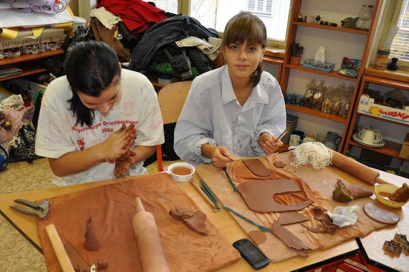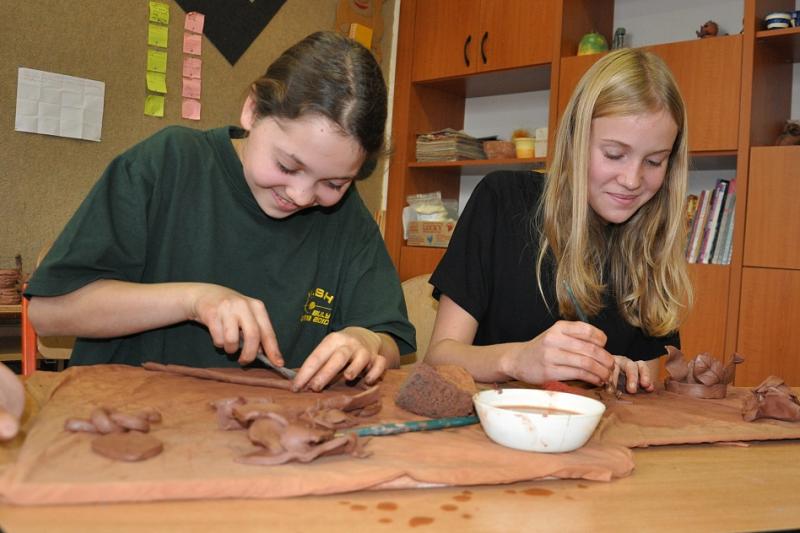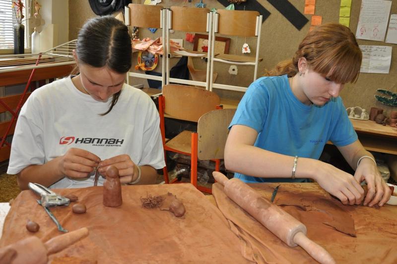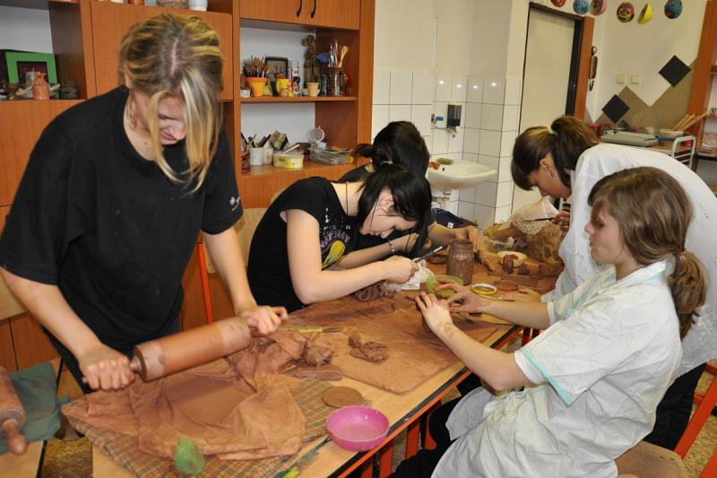 Domluvili jsme se tedy ve Školním klubu a ve středu 9. listopadu vyrazili – odění do starých triček, plášťů a jiných "pracovních" hadříků – do budovy ŠK v Ruské ulici vyzkoušet si práci s keramickou hlínou.