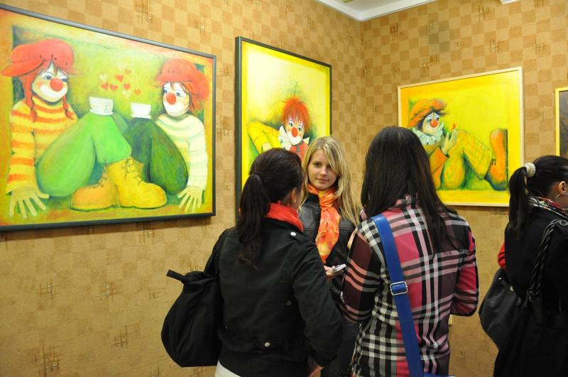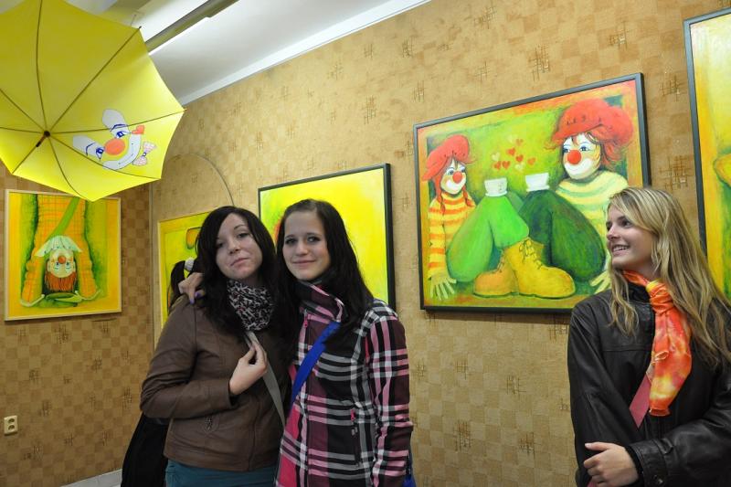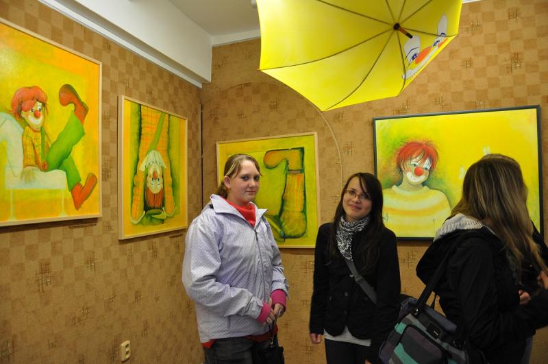 Pokud si vzpomínáte, ten den v Plzni lilo od rána. Zima a nevlídno doslova zalézaly pod kůži. Snad o to hřejivěji na děti i učitele působil nevelký interiér galerie i plátna či deštníky zářící teplými sluníčkovými barvami s motivy motýlů a klaunů, vůbec ne smutných, naopak veselých a rozesmátých, zkrátka pozitivních. Moc se nám tam líbilo, fajn byly i komentáře k některým obrazům, konfrontace názorů.