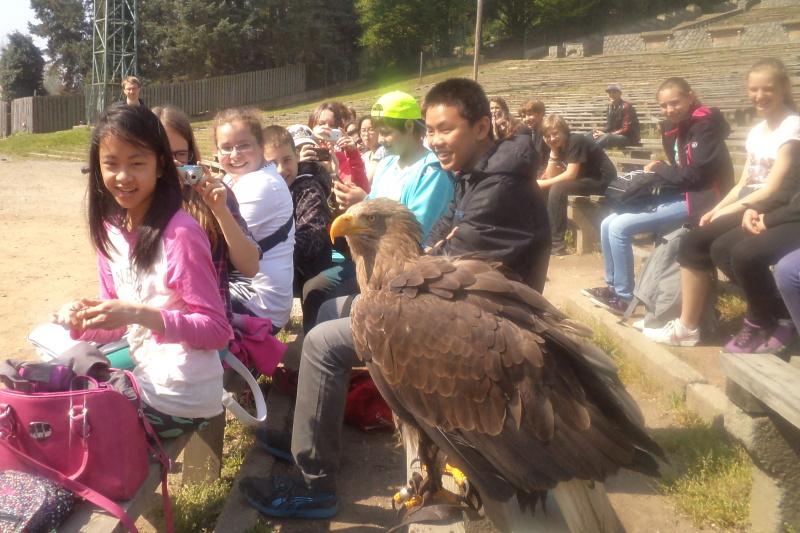 Dalším úžasným zážitkem byla přehlídka dravců a sov s ukázkami jejich výcviku. Viděli jsme je i velice zblízka, neboť si mezi nás orel sedl na lavičku a poštolka zase na hlavu spolužáků. Pan učitel pořídil velmi krásné detailní záběry řady zvířat a i další fotografie dokládají, že jsme si to užili.
