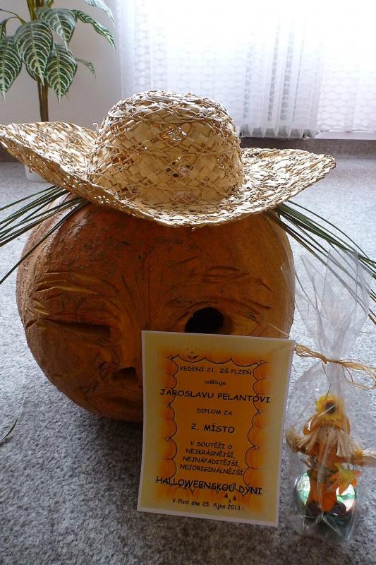 Na 3. místě s počtem 22 hlasů skončily shodně dýně č. 31 od Martina Vondráčka ze 4.A třídy a č. 23 od Kristýnky Jindrové ze 4.C třídy. 44 hlasů vyneslo na 2. místo největší dýni č. 10, jejímž autorem byl Jaroslav Pelant ze 7.B.