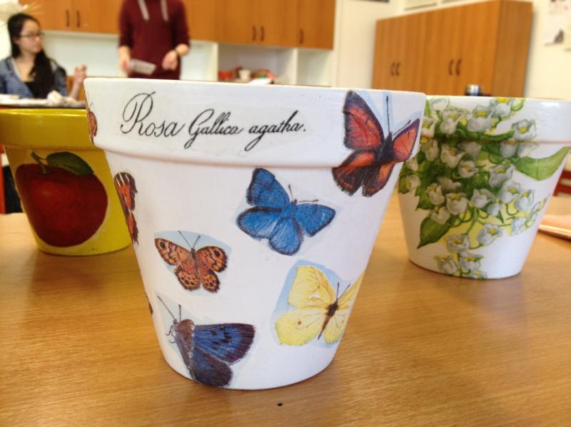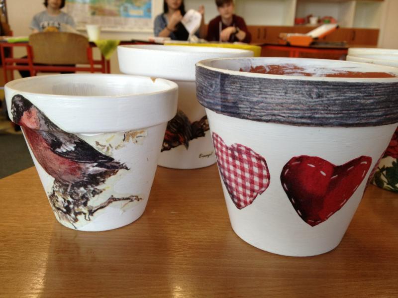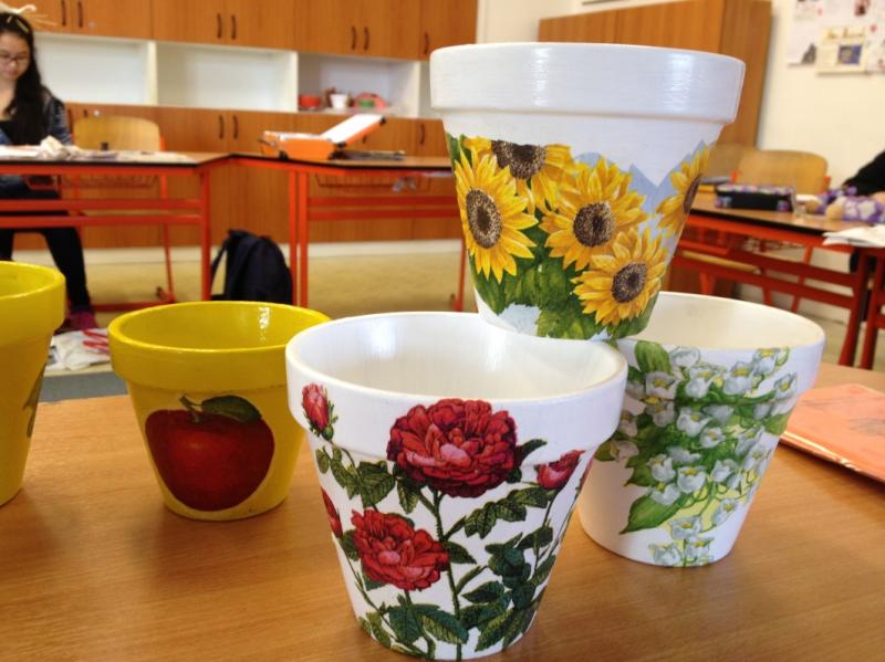 Na jednom z workshopů v Národopisném muzeu Plzeňska jsme si vyzkoušeli ubrouskovou techniku na drobné bílé oblázky. Tak nás zaujala, že jsme v rámci „vítání jara“ zakoupili keramické květináče, natřeli je akrylovými barvami, což byl sám o sobě zážitek – vyměnit malé štětce za takové, se kterými se skoro natírají ploty, a pak piplačka s ubrousky a speciálním lepidlem. Výsledky – úžasné, a to hned napoprvé – viz fotografie. Děti už ve škole plánovaly, zda do nich něco zasadí či jen zakoupí kytičku v plastovém květináči a ten zdobený použijí jako obal.