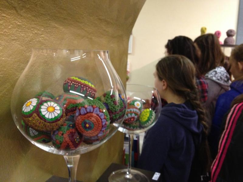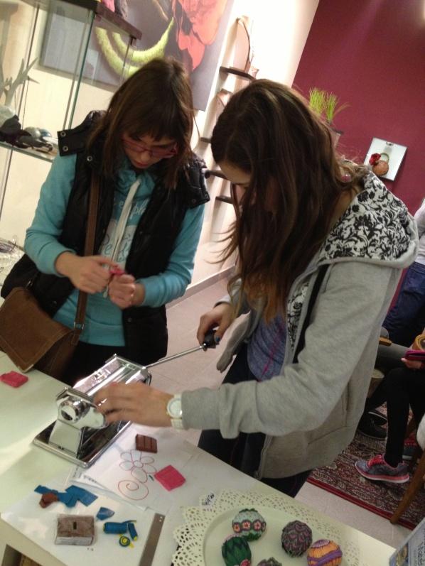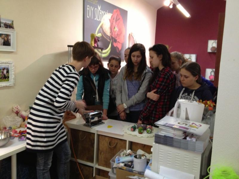 Možná si nikdo z nás ani podle obrázků neuměl konkrétně představit, jak takové polymerové vajíčko může vypadat. Stále jsme si říkali – něco mi to připomíná... no, vajíčka vypadaly trochu jako z gumy. Pestré barvy, jemné vzory, precizní zdobení... Paní majitelka nám kromě zajímavého vyprávění také přiblížila, jak se s hmotou pracuje, ožmoulali jsme si ji v rukou, zkusili pracovat na malém lisu, hmotu jsme krájeli i rolovali do malých spirálek.