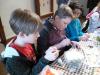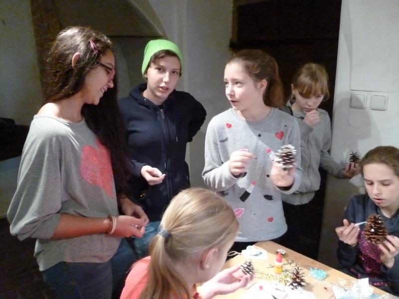 Následovalo tvoření jmenovek k dárkům pomocí malých tiskátek s motivy sněhových vloček. Dále ubrousková technika neboli decoupage na bílé kamínky, dekorování šišek, drátkování (hvězdičku ze silnějšího drátku jsme omotávali slabším drátkem s navlečenými korálky), vystřihování ozdob např. z korku či z látek, odlévání a barvení svíček, lovení „nejen zlatých“ rybek ve starých neckách, nákupy krásných „hand-made“ dárků, perníčků, bylinek apod.