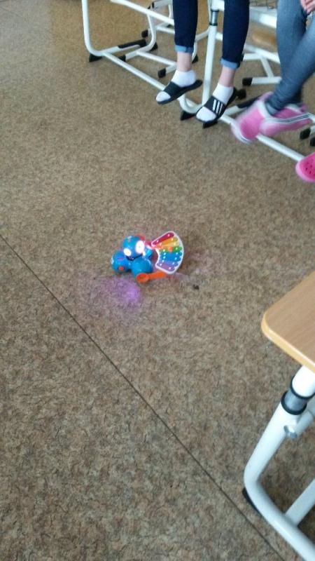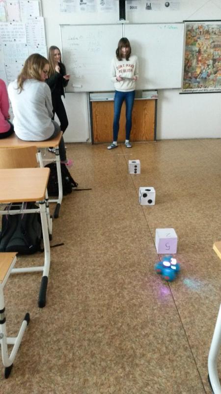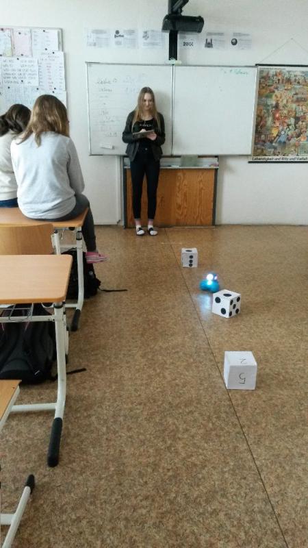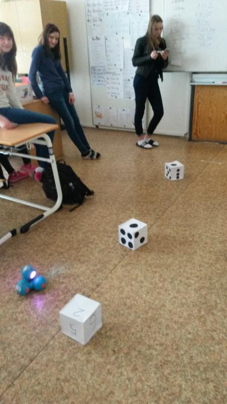 S pomocí tří aplikací - Go, Path a Xylo - jsme se učily robotíky ovládat. Takže jsme si s nimi jezdily sem a tam, měnily jim blikající barvičky a tlukot jejich srdcí, nahrávaly jim text, který nás momentálně napadl a oni ho po nás roztomile opakovali. Plánovaly jsme jim trasu po silnici s různými překážkami a funkcemi a dokonce jsme v aplikaci Xylo na tabletu naprogramovaly píseň “Ovčáci čtveráci“, kterou nám pak robotík přehrál.