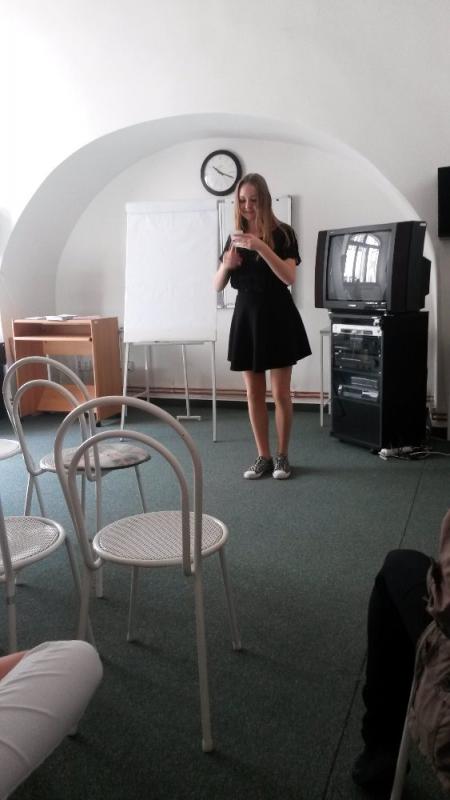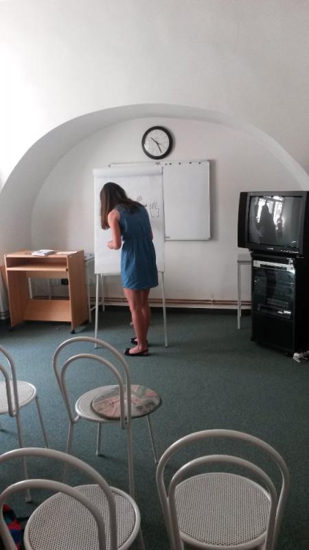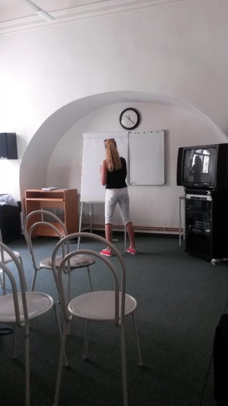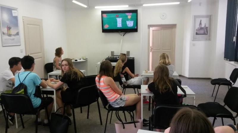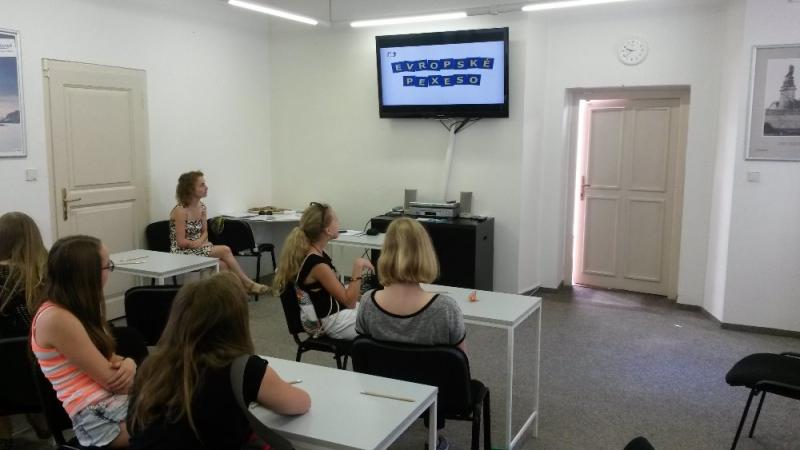 Na nádvoří Evropského domu jsme byli rozděleni na 3 skupiny, protože aktivity se odehrávaly na třech stanovištích. Na prvním stanovišti si děti zahrály “Activity“ se slovy, které charakterizují země Beneluxu. Slovně, pantomimicky nebo kresbou měly znázornit slova např. kolo, král, vinice, slunečnice, hrad apod. Byla to velká zábava, protože přiblížit členům své skupiny některé slovo bylo docela obtížné. Výherní skupinka byla odměněna a šlo se dál.