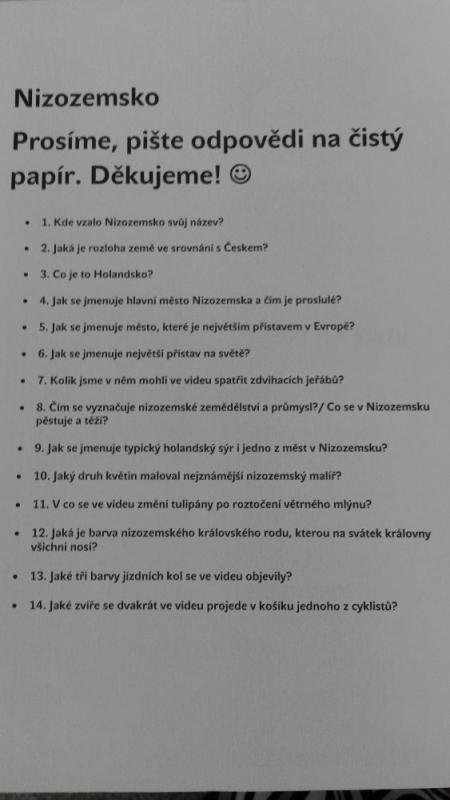 Posledním stanovištěm bylo promítání krátkého filmu o Nizozemí, kde jsme se k našemu údivu mimo jiné dozvěděli, že správný název státu je Nizozemí, nikoliv termín Holandsko. Holandsko je pouze část území v Nizozemí, obdobně jako naše Morava. Po zhlédnutí krátkého filmu, vyplnění soutěžního kvízu, který obsahoval informace z filmu a samozřejmě odměně za nejlépe zodpovězený dotazník jsme se rozloučili se zástupci Evropského domu a hurá do “mekáče“. Protože bylo krásné letní počasí, vydali jsme se po krátkém občerstvení pěšky podél řeky Radbůzy zpět ke škole. Cestou jsme rozjímali o bezstarostných prázdninách, které nás od pozítří čekaly. Takže ještě vyzvednout vysvědčení a hurá na prázdniny.