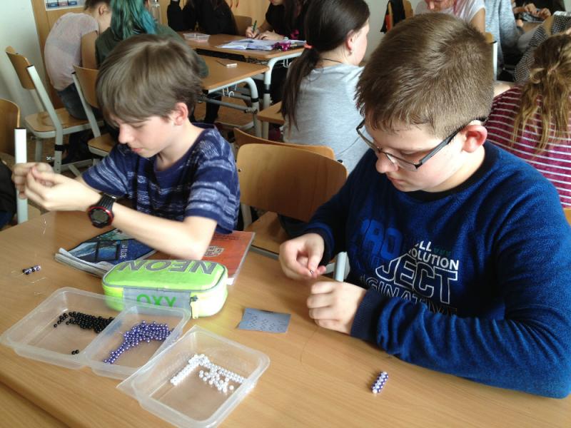 Děti byly rozděleny na 2 skupiny. Jedni navlékali pestré větší korálky na pružný vlasec a tvořili náramky. Druzí si pomocí šablon, silnějších barevných drátků a následným omotáváním slabšími drátky s navléknutými korálky vyráběli květiny či motýly.