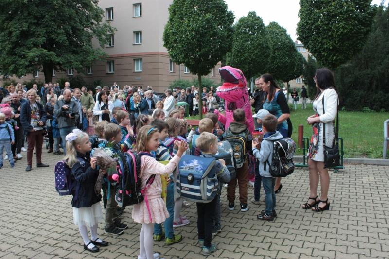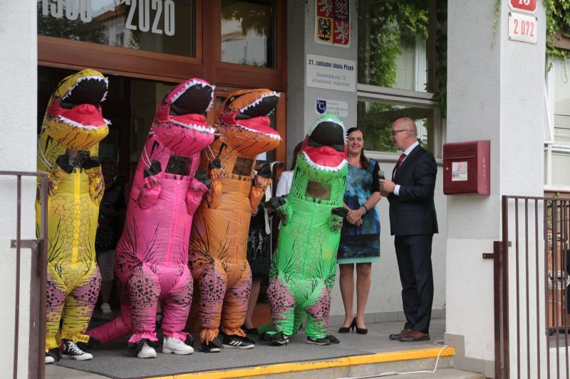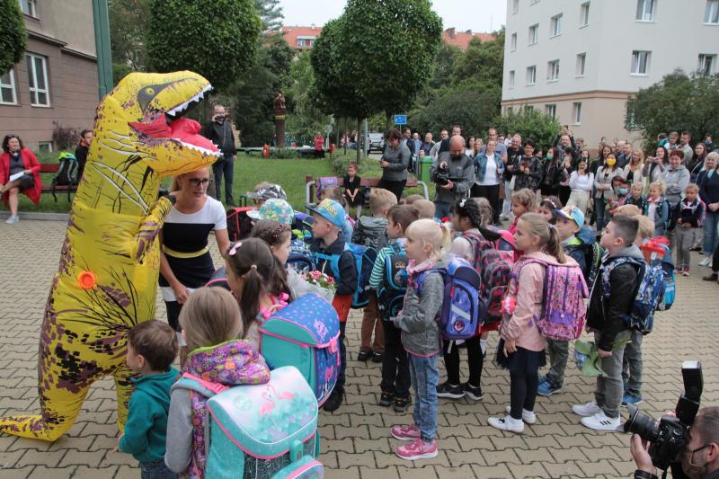 A proto při slavnostním otevření školy přišel děti, rodiče, učitele, vychovatelky a naše milé hosty z plzeňského magistrátu (pana primátora Mgr. Martina Baxu a náměstkyni primátora paní Bc. Evu Herinkovou) pozdravit dinosaurus Jednadvacík.