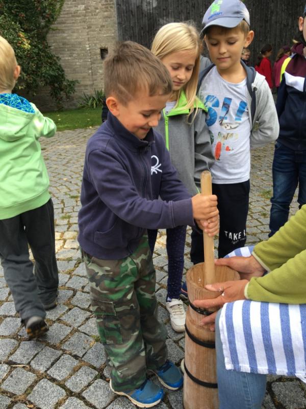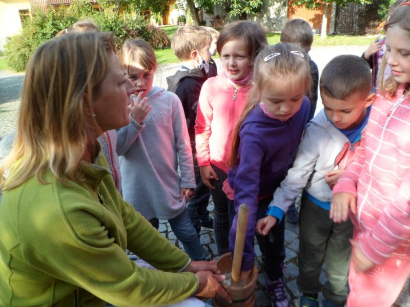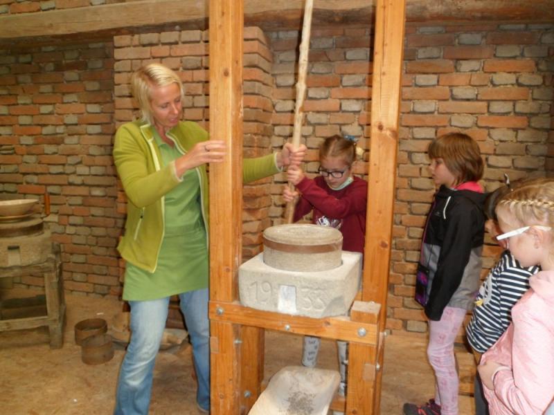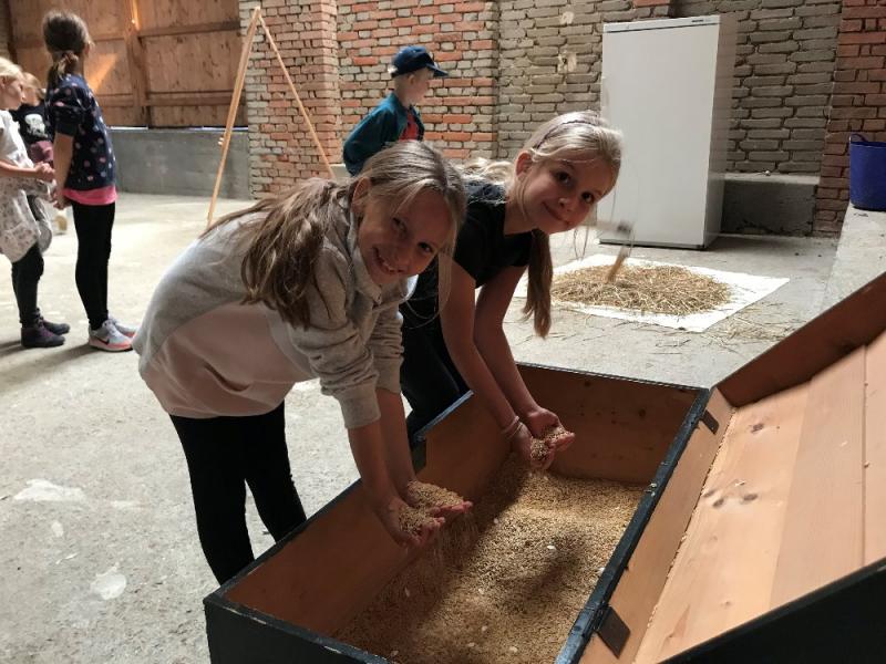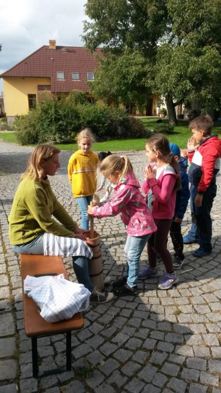 Své o tom vědí druháci, kteří právě zde prožili 24. září svůj projektový den. Den začal opravdu po farmářsku. Během chvilky děti zjistily, že vyrobit máslo ze smetany není nic nemožného, získat mouku chce trpělivost a že důležitým pracovním nástrojem farmáře jsou jeho ruce. A ty skutečně nezahálely: dojily mléko, stloukaly máslo v máselnici, kosily obilí, klasy mlátily cepem a ve mlýně roztočily mlýnská kola tak, že mouka na sebe nedala dlouho čekat.