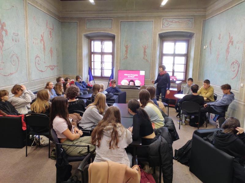 Tato instituce sídlí na náměstí Republiky ve Scriboniovském domě. Přivítala nás fr. lektorka Fanny a obeznámila nás s činnostmi AF. Pořádají se zde rozmanité kulturní i společenské akce, kurzy, festivaly, výstavy, hudební, filmové i degustační setkání, přednášky, čtení pohádek či křty knížek, můžete zde dokonce i skládat mezinárodně uznávané zkoušky z fr. jazyka DELF/DALF.