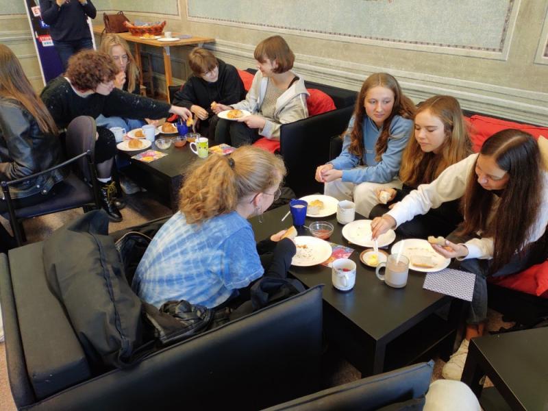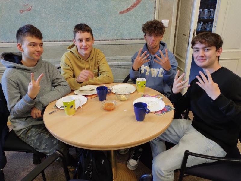 Podruhé jsme sem zavítali se skupinami z 9.A a 9.B ve čtvrtek 20. října a to na dlouho očekávanou fr. snídani, le petit déjeuner. Konala se v tzv. „Freskovém sále.“ Nejprve jsme zhlédli hezkou prezentaci na fr. reálie. Nejvíce jsme se ale těšili na samotnou snídani. Ono snídat v kolektivu spolužáků, navíc v úplně jiném než domácím prostředí, má své kouzlo. Zabořeni do pohodlných sofa a křesel jsme popíjeli ovocný čaj, většina však chocolat chaud – horkou čokoládu a pochutnávali si na tradičních bagetách s máslem a broskvovým či třešňovým džemem. Pomyslnou třešničkou na dortu pak byly máslové croissanty z pekařství u Gaëla. Oni totiž Francouzi snídají veskrze na sladko. Vše nám moc chutnalo.