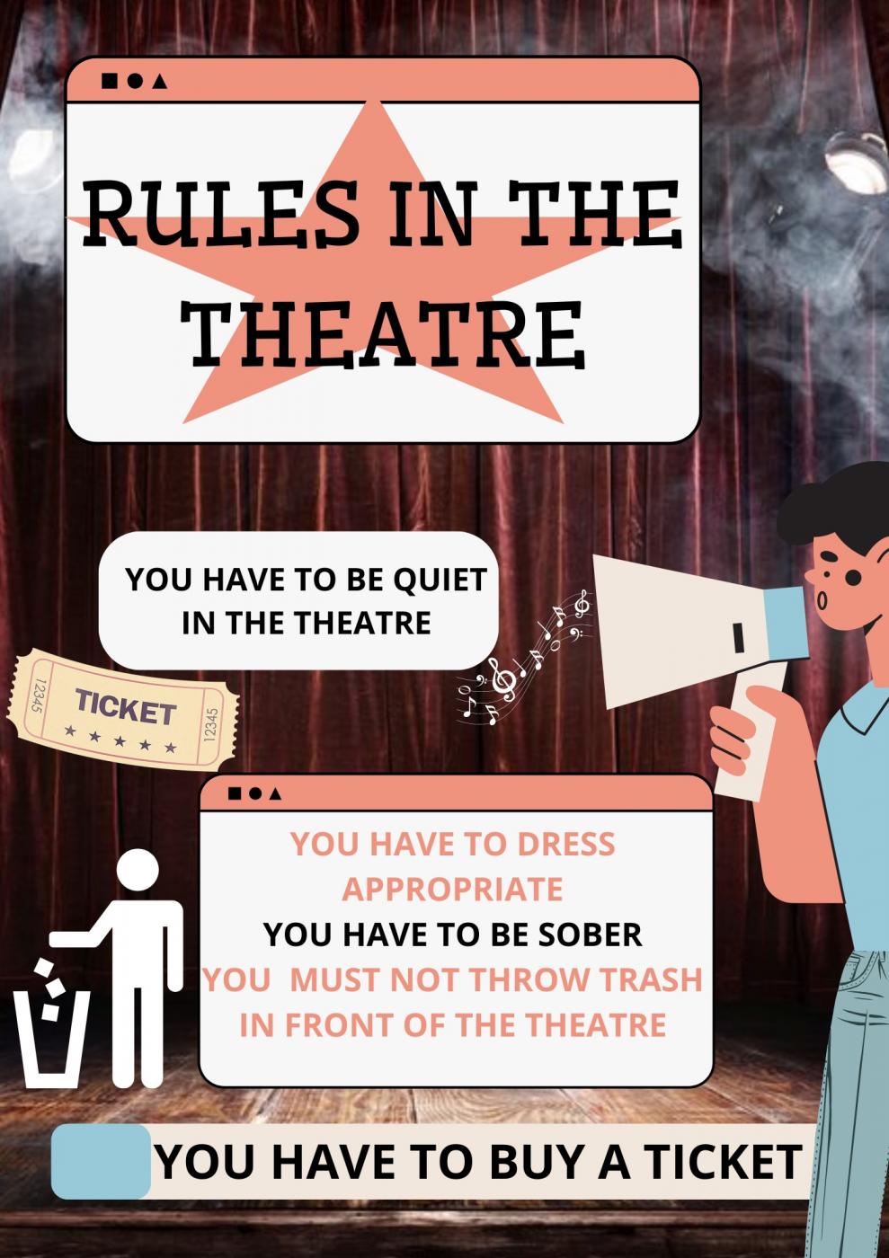 Ve skupinách jsme dostali za úkol napsat pravidla o různých místech: ZOO, divadlo, národní park a knihovna. Úkolem pro nás bylo vytvořit plakáty s pravidly a scénky, které jsme v hodinách natáčeli i stříhali do krátkých videí.