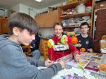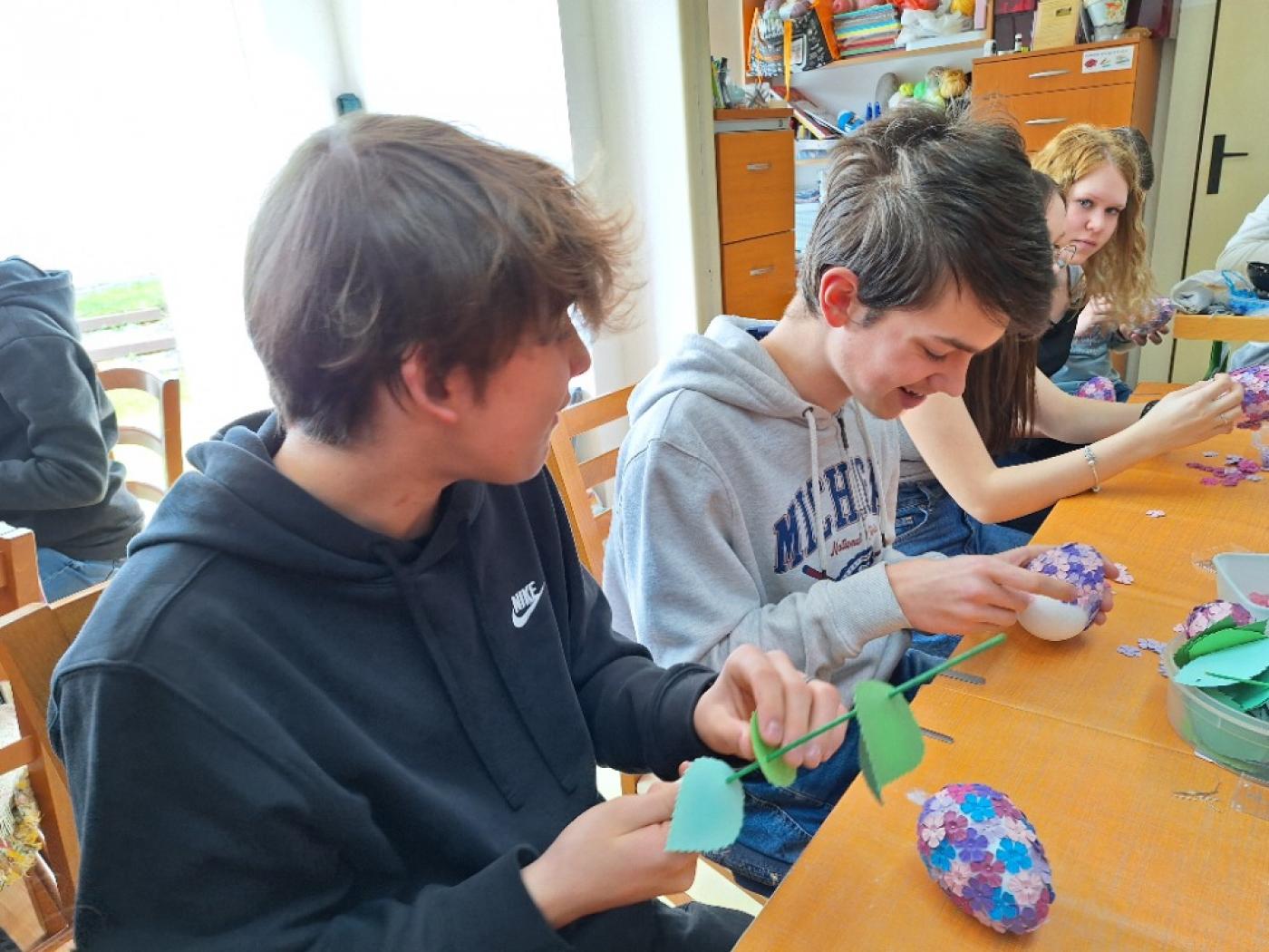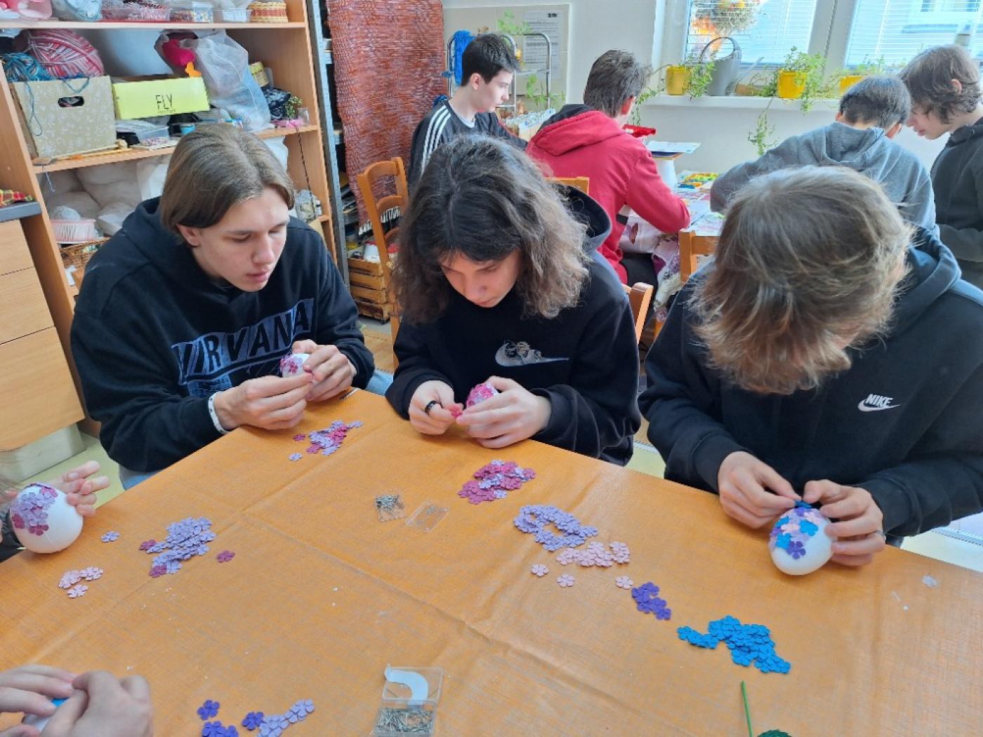 Hlavním programem byla výroba netradičního velikonočního vajíčka. Polystyrenový základ, drobné papírové kytičky různých barev, špendlíčky, zelené špejle, papírové lístky, lýko a hurá na to. Lektorky byly nadšené, jak i kluci – deváťáci – v klidu a trpělivě vrstvili kvítek ke kvítku. O děvčatech nemluvě. Asi trénink ze školy, říkala jsem si v duchu a měla z nich radost. 1,5 hodinový program utekl jako voda. V závěru jsme ještě dostali malé pohoštění. Vodu s plátky citronu a perník, po kterém se jen zaprášilo. Na zahrádce, mimochodem velmi pečlivě udržované (tato aktivita také patří mezi ty terapeutické) jsme si ještě mohli koupit výrobky klientů dílny, vše s jarní a velikonoční tematikou, kraslice, věnečky, látkové zápichy, šitá zvířátka, korálkové náramky. Nešlo odolat, krásné pečlivé dekorace a za ceny, které si ruční práce, potažmo od lidí s postižením, skoro nezaslouží.