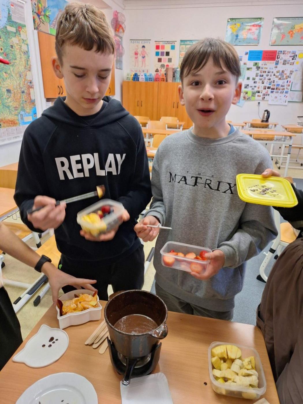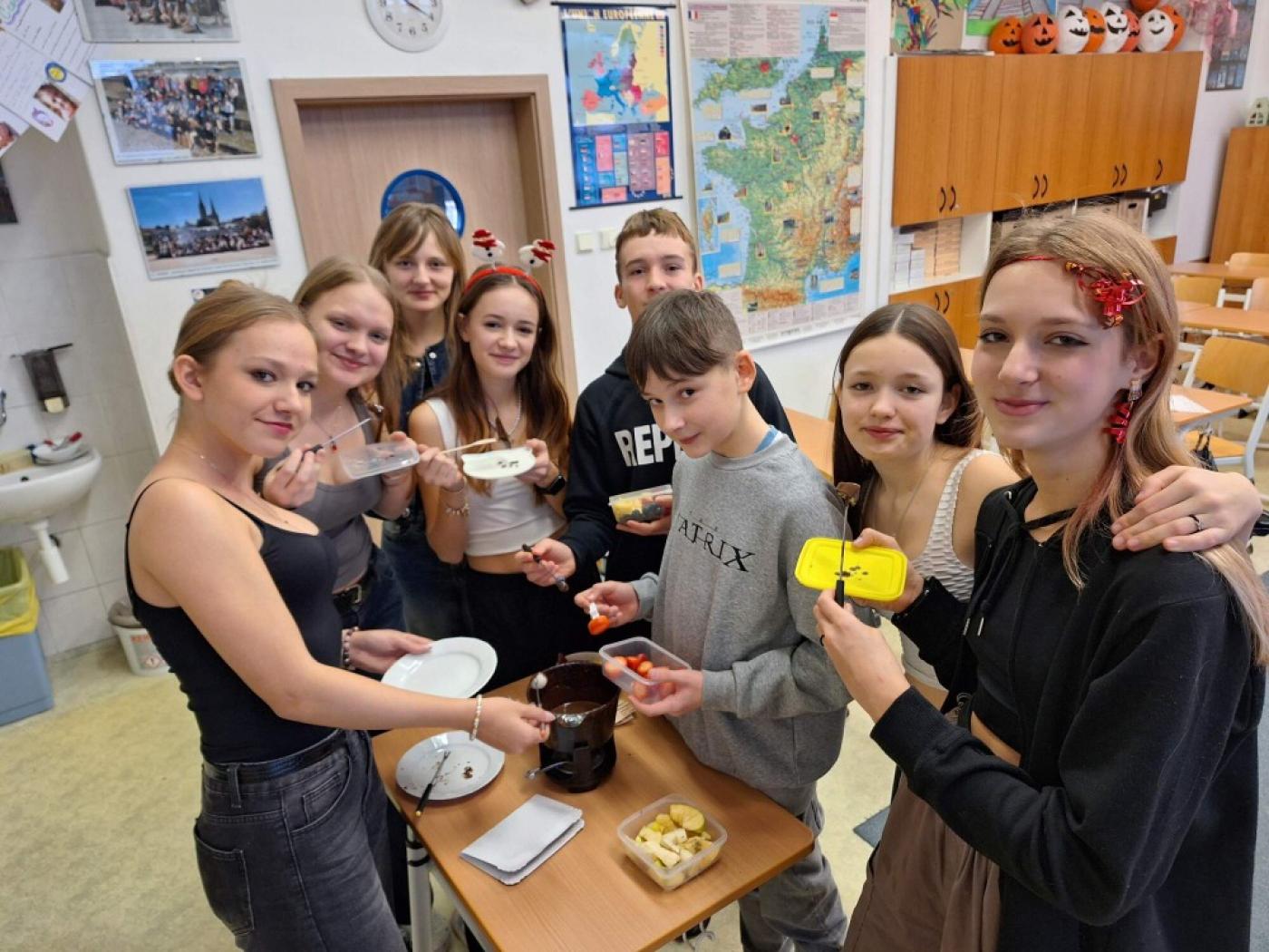 Těžko si asi představit předvánoční hodiny francouzštiny na naší škole bez tradiční speciality. Tou je mlsání ovoce namočeného do krásně rozpuštěné čokolády v kotlíku na fondue. Kdyby jen ten kotlík mohl vyprávět… tolik příběhů o spokojenosti.