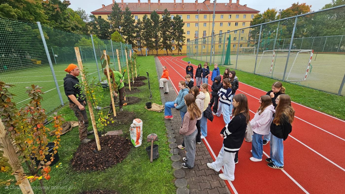 Kdo říká, že hodina přírodopisu musí být jen o sezení v lavici a kreslení jablíčka do sešitu? Naši sedmáci ze 7. A by s tím rozhodně nesouhlasili! V rámci probíraného tématu sady a ovocné zahrady jsme totiž vyrazili přímo do terénu – konkrétně na školní hřiště, kde právě probíhala výsadba nových ovocných stromů.