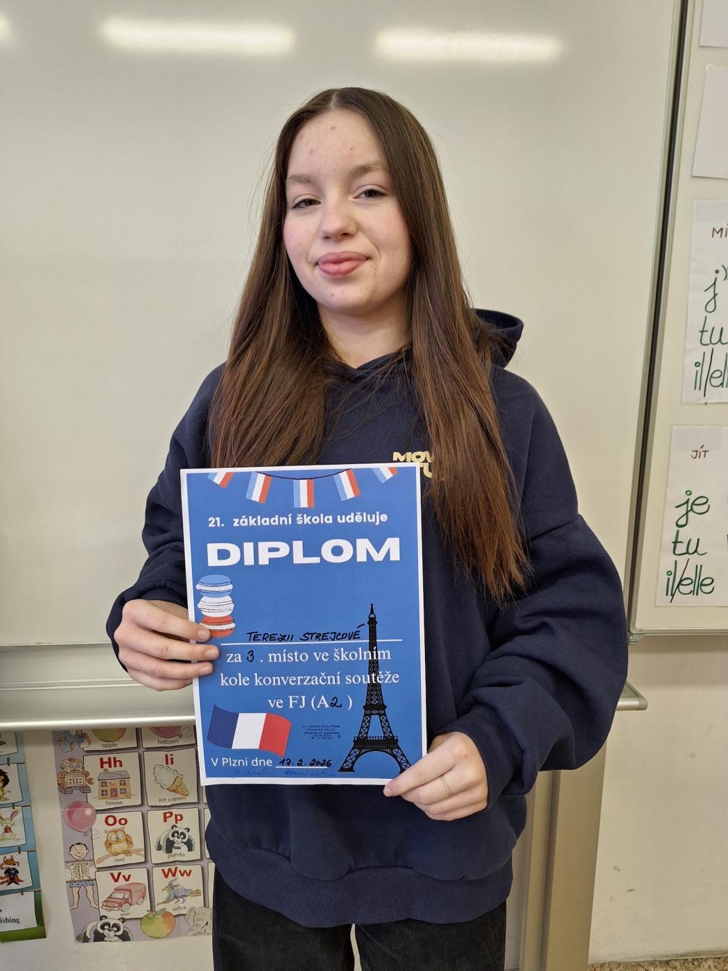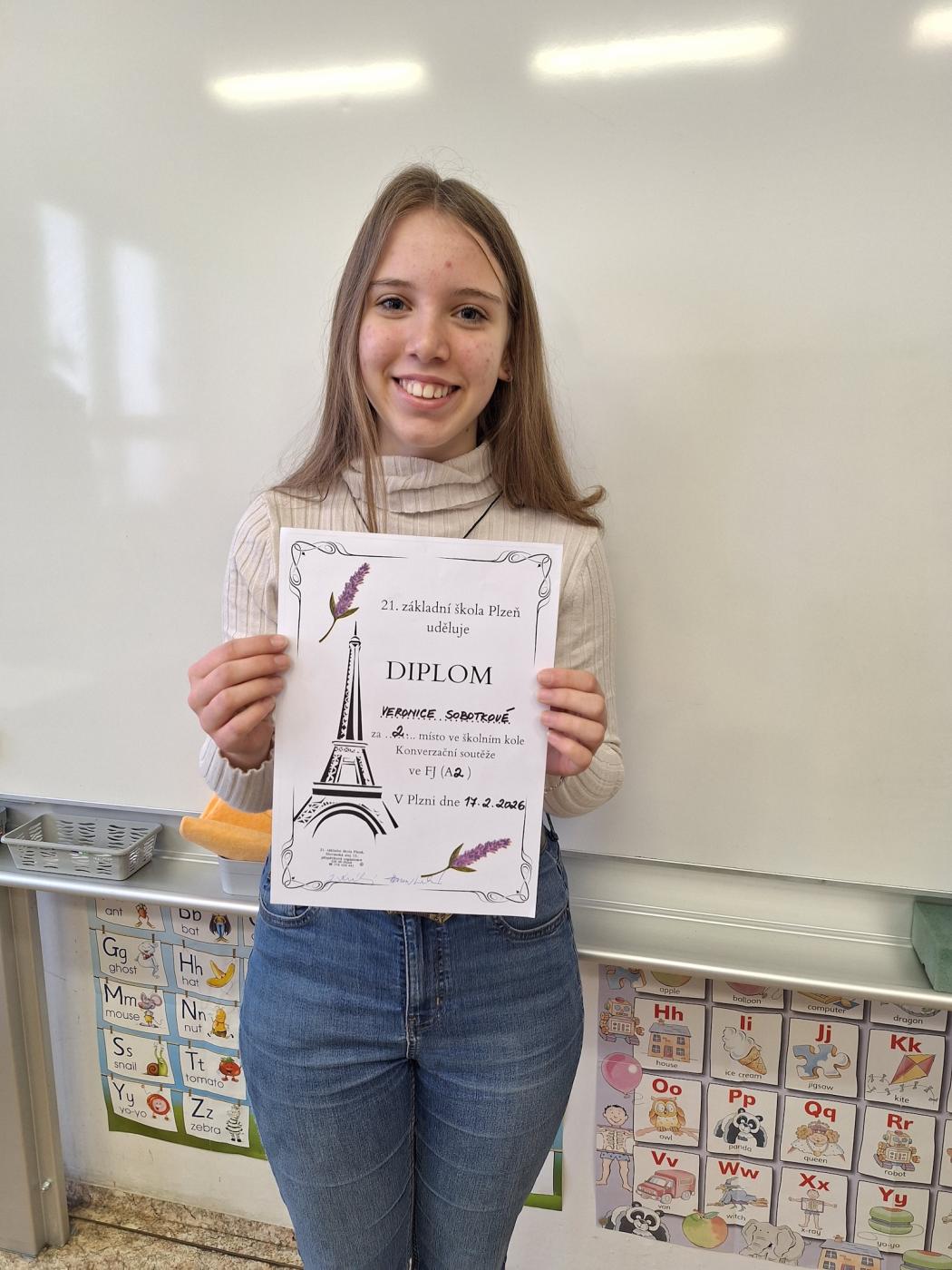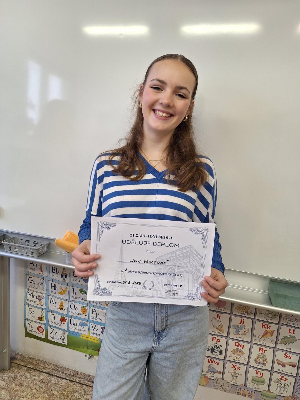 První místo obsadila Julie Vracovská, druhé místo s rozdílem pouhého půl bodu získala Veronika Sobotková a místo třetí patří Terezii Strejcové. Julie Vracovská a Veronika Sobotková budou naši školu reprezentovat v krajském kole konverzační soutěže, které proběhne dne 19. března 2026. Všem soutěžícím děkujeme za účast, vítězkám gratulujeme k pěknému umístění a přejeme hodně úspěchů v krajském kole.