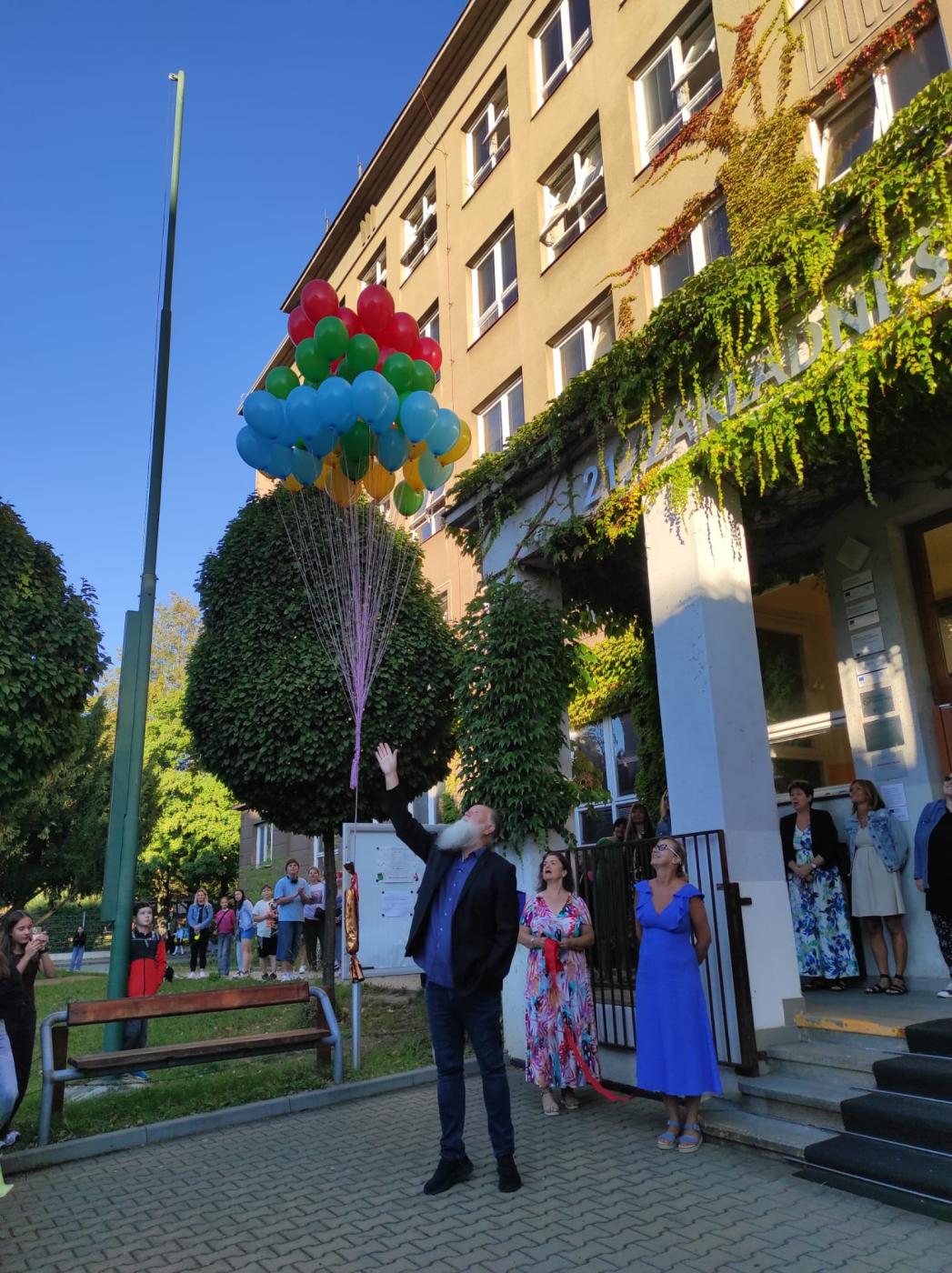 Součástí slavnostního dopoledne bylo vypuštění 65 barevných balónků svázaných do jednoho velkého shluku. Na balónky jsme připevnili dopisy napsané v pěti jazycích, které se na naší škole vyučují. Ve vzkazech vyzýváme jejich případné nálezce, aby se nám ozvali a dali vědět, kam až balónky z Plzně doletěly. Už teď jsme zvědaví, odkud se nám zprávy vrátí.